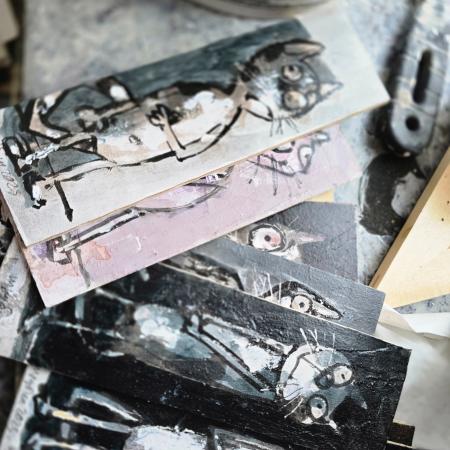 — Часто я рисую котов, когда только прихожу в мастерскую: на обрывках картона, клочках бумаги. Можно сказать, что так я веселюсь и «расписываюсь», — рассказывает Дмитрий Трубин. — Ничего серьезного в них не вкладываю. Да и натуралистическая кошка меня совершенно не интересует — все они у меня очеловечены.