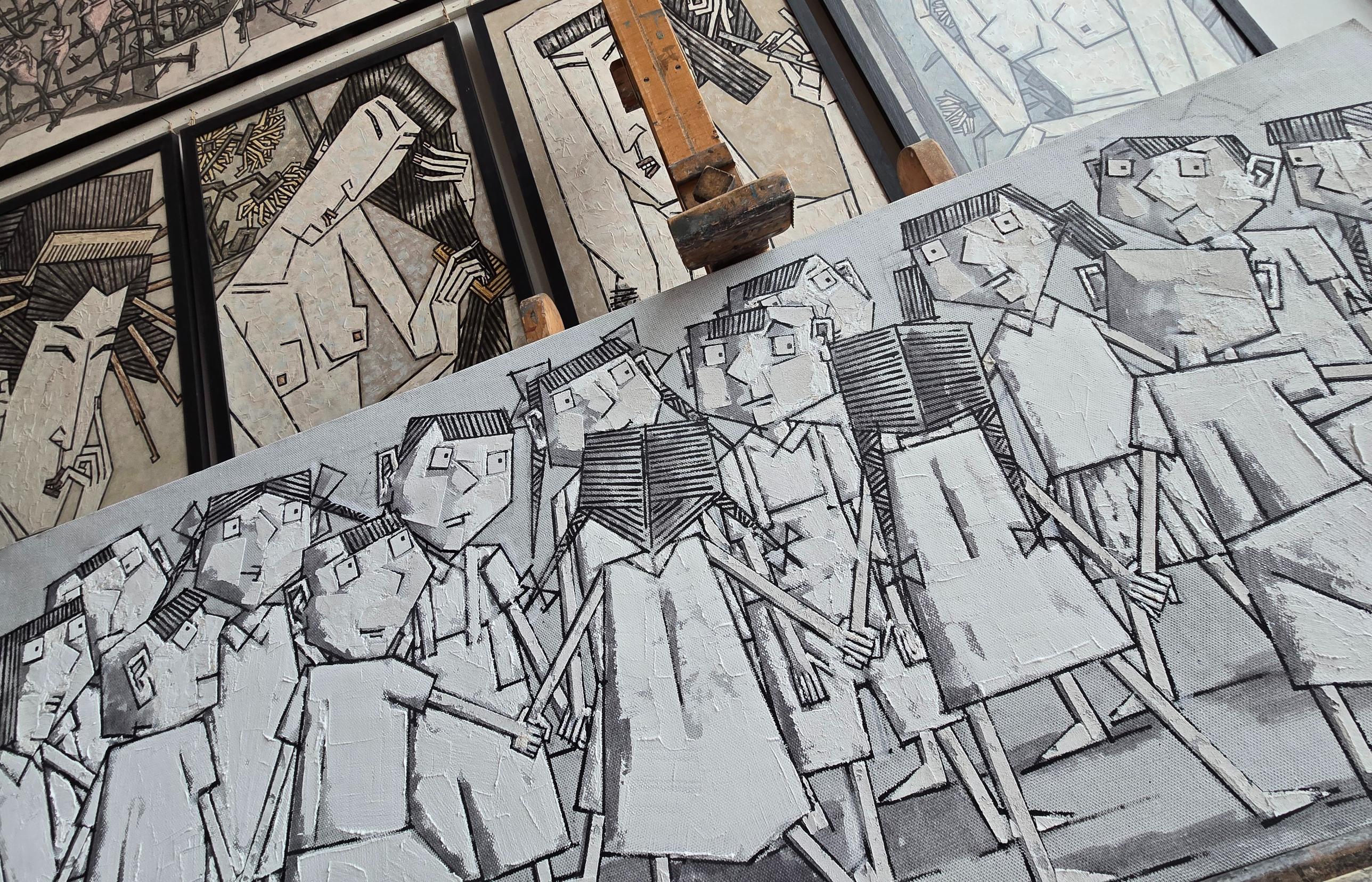 Первые работы линеарного цикла были архитектурными: лестничные марши, пространства, где прямая линия выглядит естественно. Затем художник достаточно смело перешел к изображению человека. В прямых линиях он «переписал» большинство любимых мастеров — и даже самого себя.