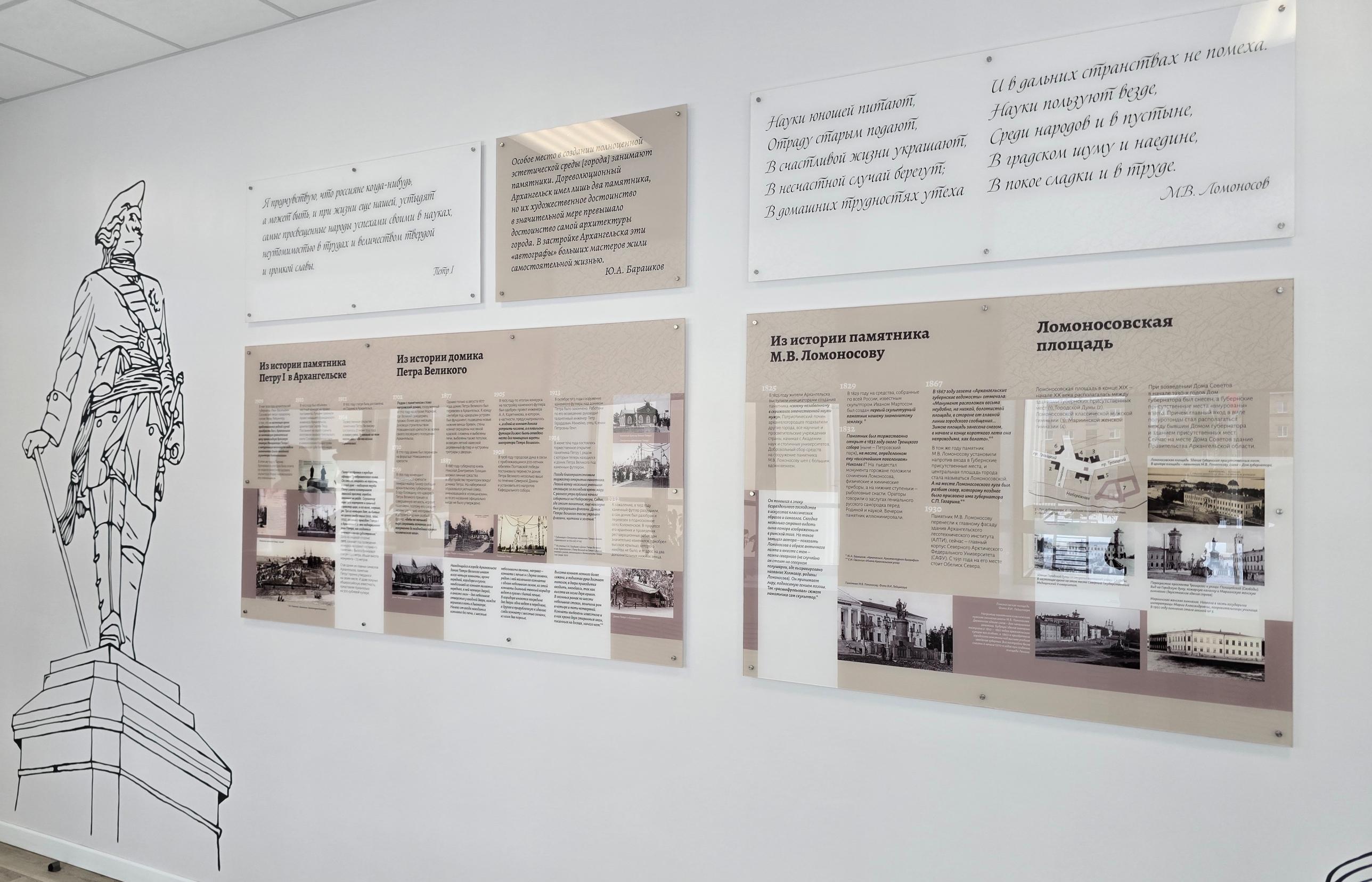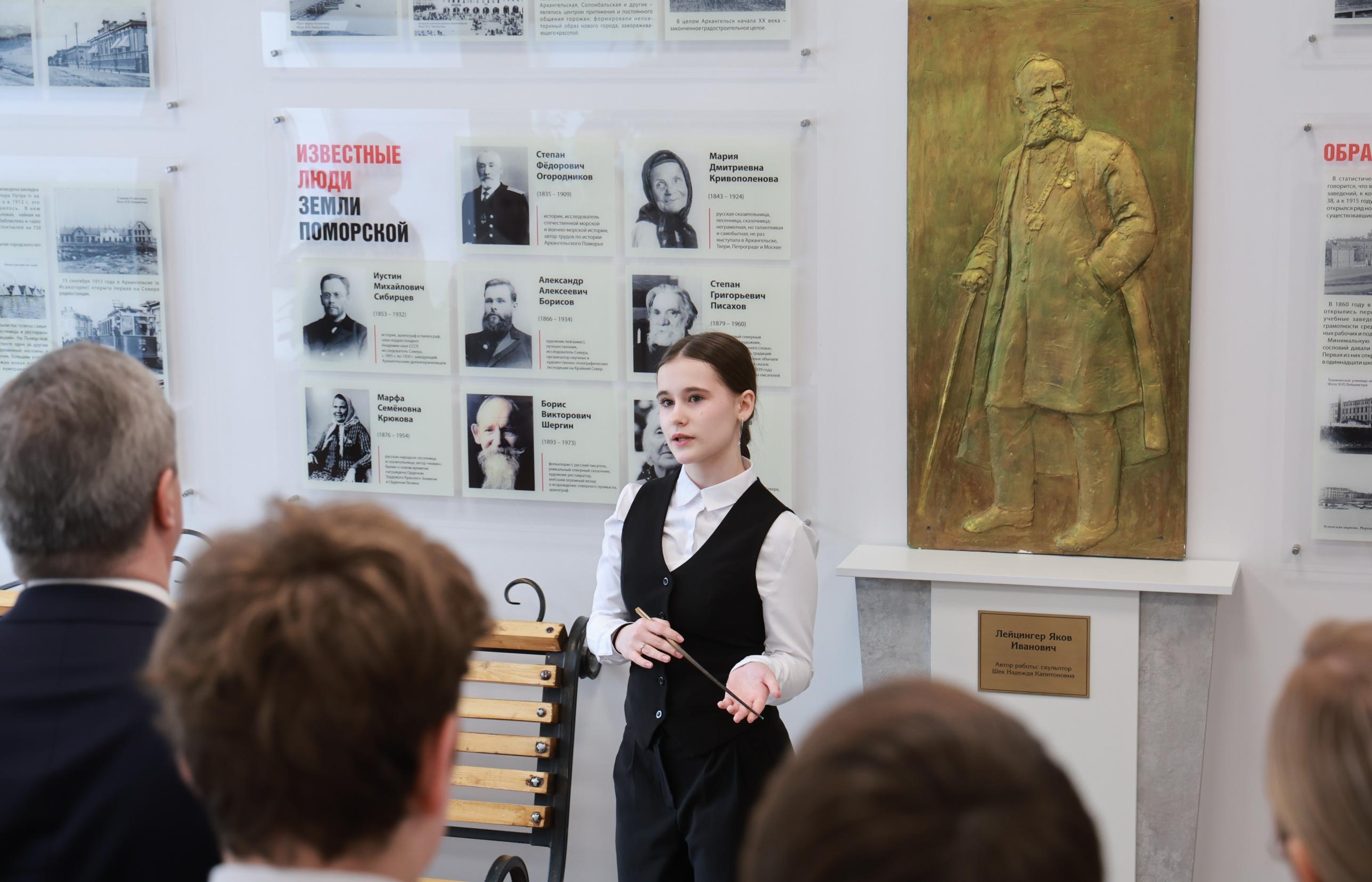 Директор школы Ольга Труфанова провела экскурсию по обновленному пространству, особое внимание уделив музейным экспозициям. В конце 2014-го школе было присвоено имя Якова Лейцингера — выдающегося градоначальника, фотохудожника и общественного деятеля. Это решение неслучайно: здание школы расположено в историческом районе Немецкой слободы, также она славится высоким уровнем преподавания немецкого языка — родной речи семьи Лейцингеров. Ученики и педагоги ведут масштабную исследовательскую работу. Изучение архивов, встречи с потомками почетного гражданина Архангельска и сбор материалов переросли в 2016 году в полноценную экспозицию, которая занимает почетное место в здании школы.