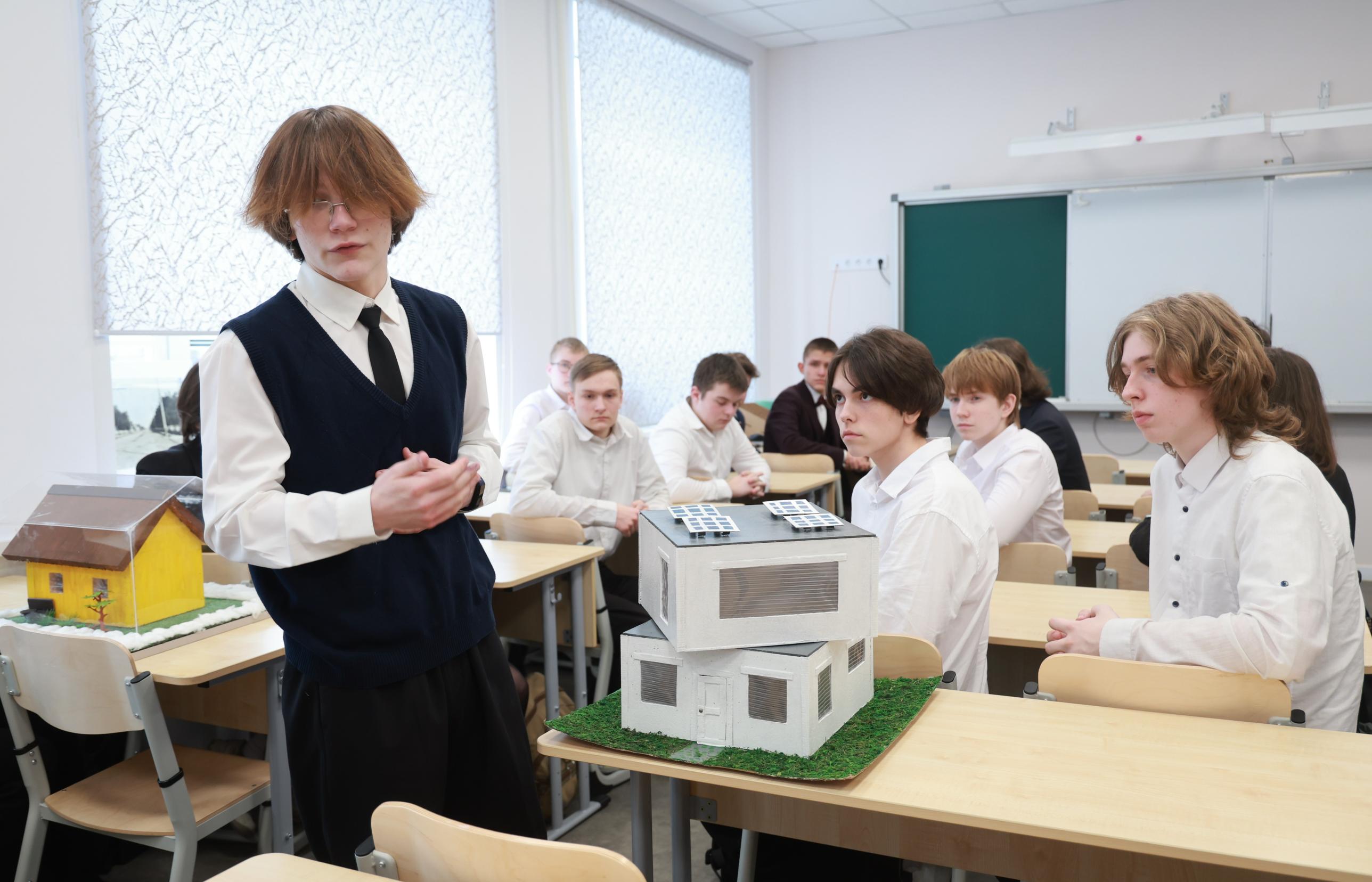 Дмитрий Морев также посетил учебное занятие судостроительного класса — пообщался с ребятами и ознакомился с их проектами. Так, один из учеников продемонстрировал макет энергоэффективного дома под куполом, работающего на принципе парникового эффекта. Михаил показал концепт двухэтажного дома с вращающимся вторым этажом на ременной передаче и солнечными панелями на крыше.