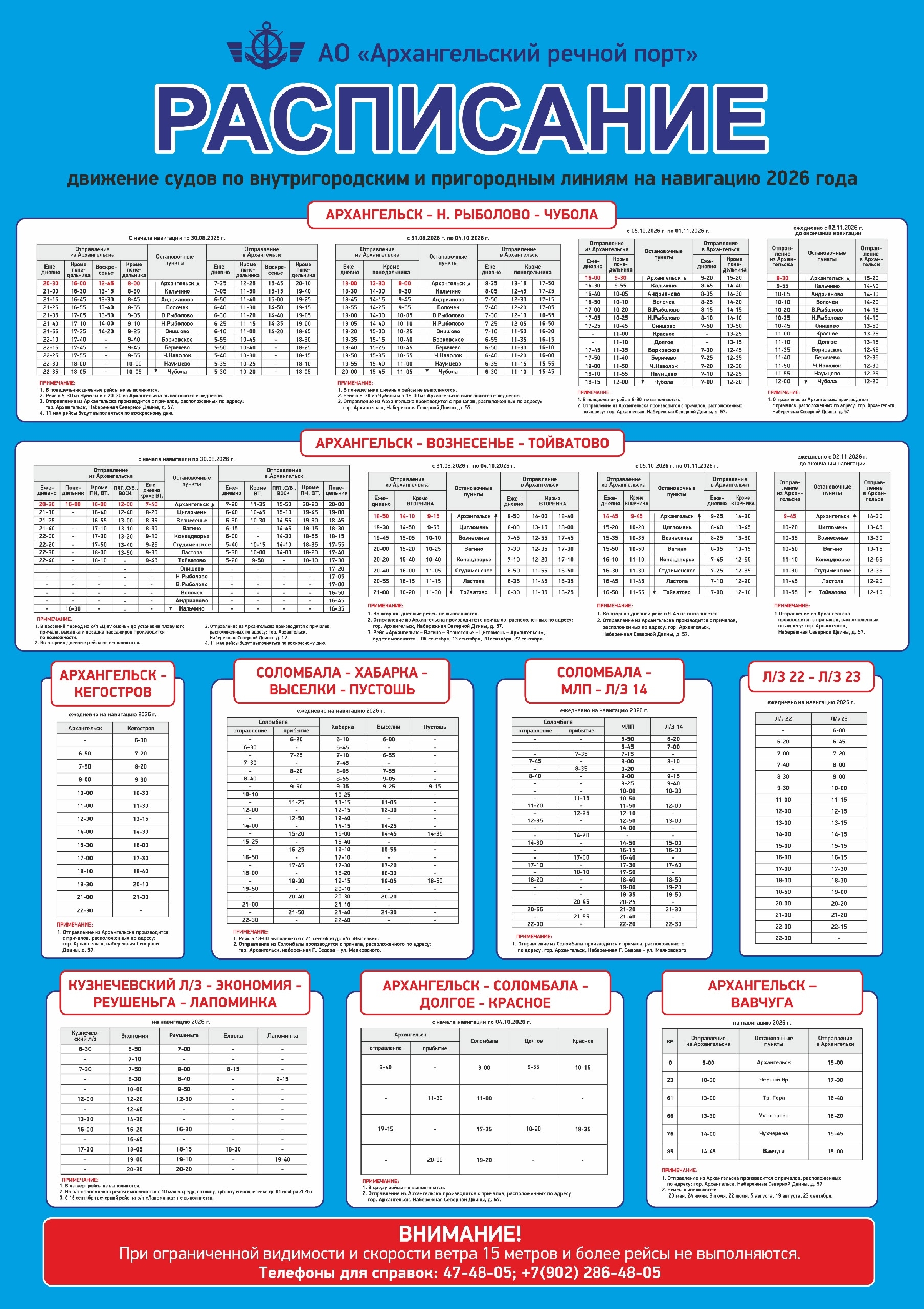 Традиционно пассажирские суда будут обслуживать городские и межмуниципальные маршруты: Архангельск — Н. Рыболово — Чубола, Архангельск — Вознесенье — Тойватово, Архангельск — Кегостров, Соломбала — Хабарка — Выселки — Пустошь, Соломбала — МЛП — Л/з № 14, Л/з № 22 — Л/з № 23, Кузнечевский л/з — Экономия — Реушеньга — Лапоминка, Архангельск — Соломбала — Долгое — Красное, Архангельск — Вавчуга. Расписание движения теплоходов аналогично прошлому году. Изменения коснулись только линии Архангельск — Вавчуга. На данном направлении число рейсов увеличено. Если в прошлые годы выполнялось всего три рейса за навигацию, то с этого года их будет семь. Первый теплоход отправится в Вавчугу 20 мая.